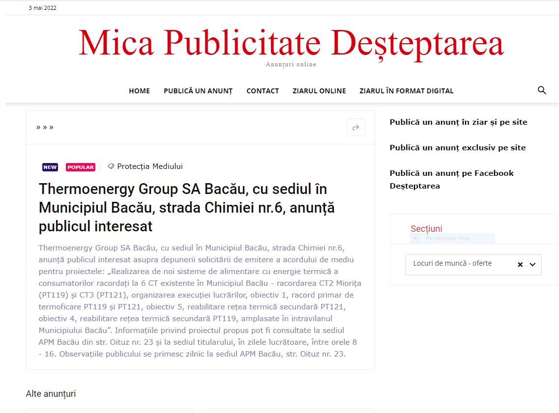 THERMOENERGY GROUP S.A. Bacau face urmatoarele anunturi pentru informarea publicului privind solicitarea acordului de mediu pentru proiectul tehnic